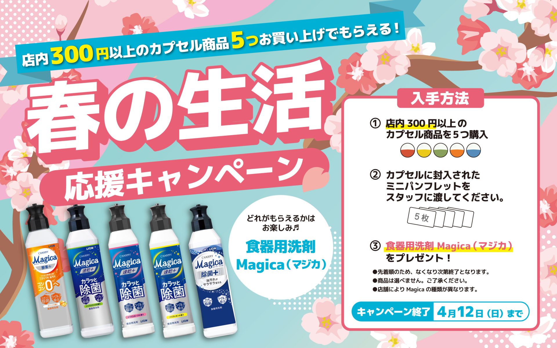 gashacoco店内にて300円以上のカプセル商品を5つご購入の方に、ミニパンフレットと交換にて先着で『食器用洗剤 Magica』をプレゼントいたします♪
