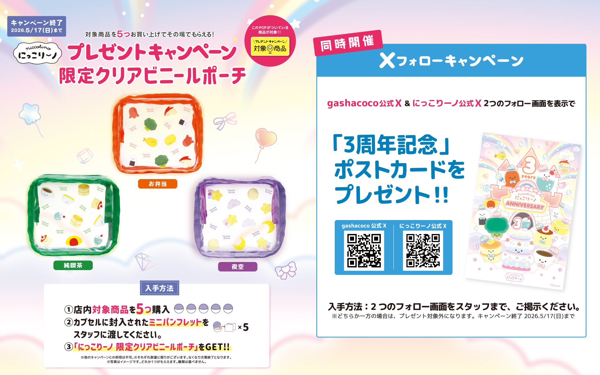 さらに、gashacoco公式Xとにっこりーノ公式X2つのフォロー画面提示で「3周年記念」ポストカードをプレゼント!!